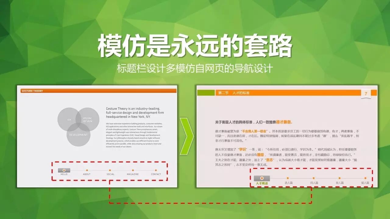 模仿是永远的套路。PPT的标题栏设计多模仿自网页的导航设计。