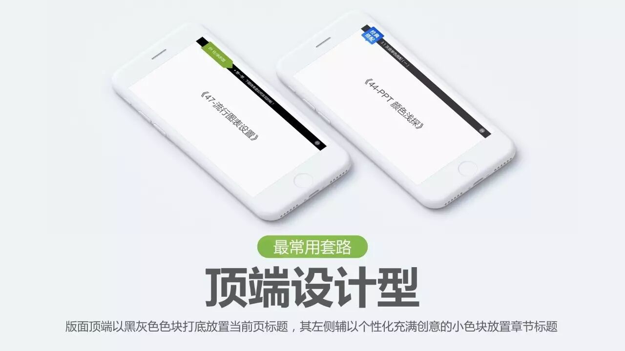 最常用套路:顶端设计型。版面顶端以黑灰色色块打底放置当前页标题,其左侧辅以个性化充满创意的小色块放置章节标题。同时,一般右侧放置页码,反正这空间闲着也是闲着。