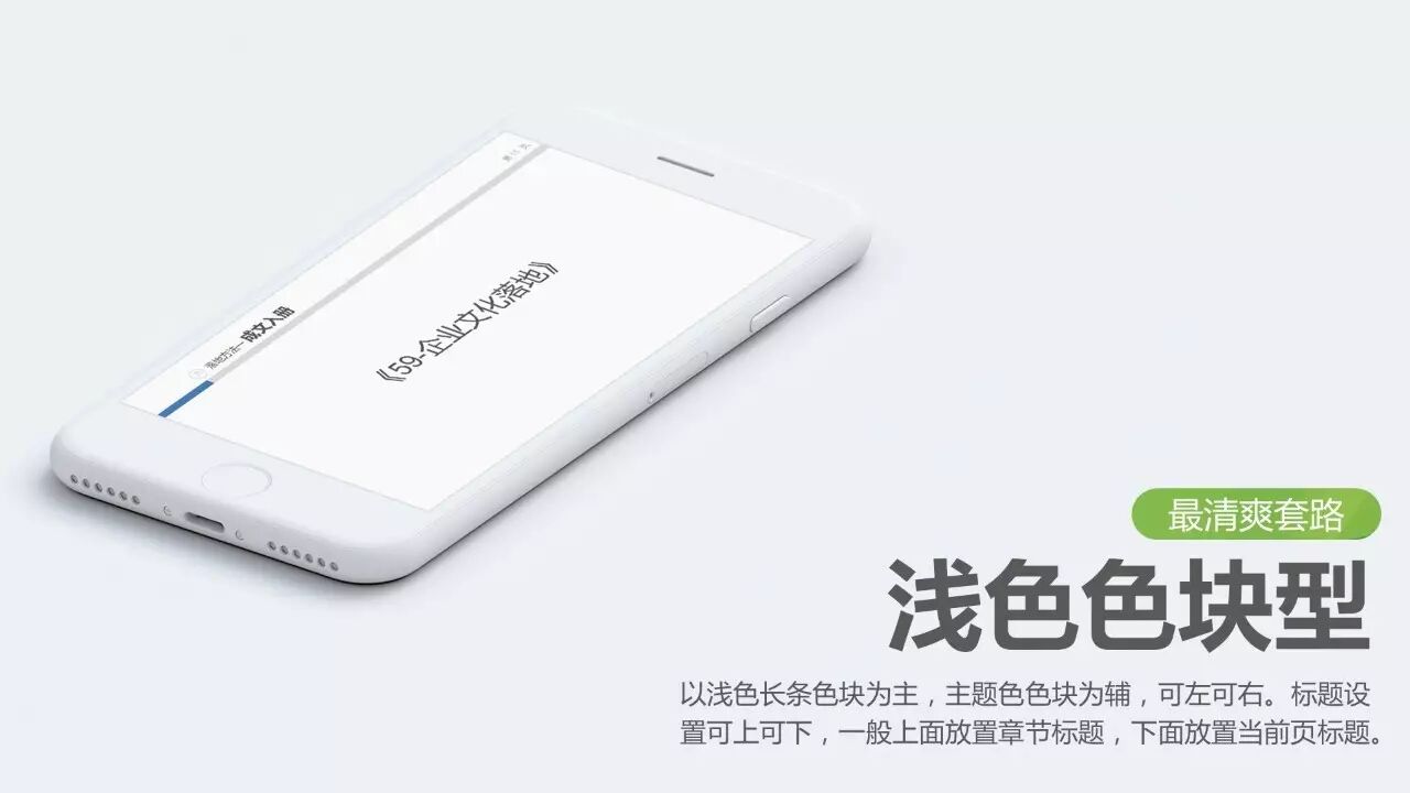 最清爽套路:浅色色块型。以浅色长条色块为主,主题色色块为辅,可左可右。标题设置可上可下,一般上面放置章节标题,下面放置当前页标题。