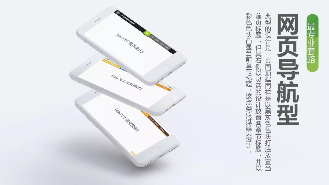 最专业套路:网页导航型。即,标题栏像网页导航一样包含各章节标题。典型的设计是,页面顶端同样是以黑灰色色块打底放置当前页标题,但其右侧以灵活的设计放置各章节标题,并以彩色色块凸显当前章节标题,这点类似过渡页设计。