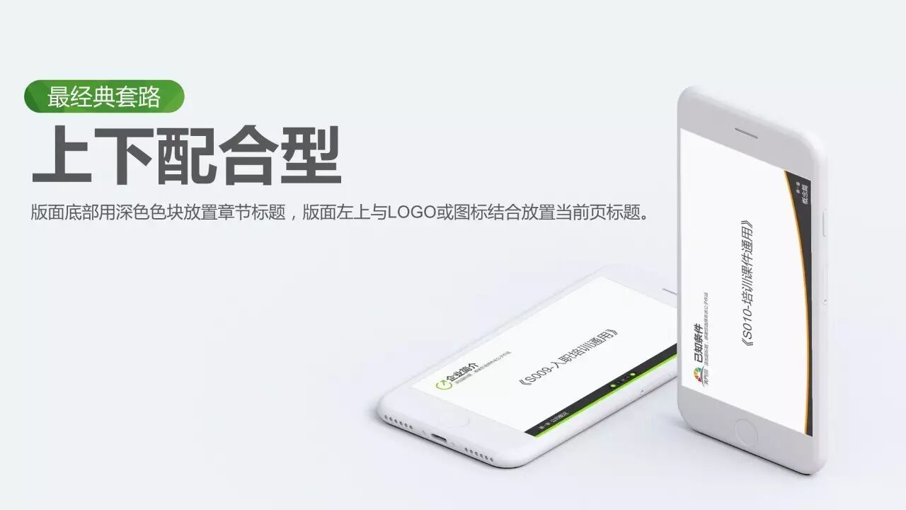 最经典套路:上下配合型。版面底部用深色色块放置章节标题,版面左上与LOGO或图标结合放置当前页标题。底部的色块可以灵活进行创新设计,比如若是黑灰色色块,则可以辅以色条,并加入页码的元素。