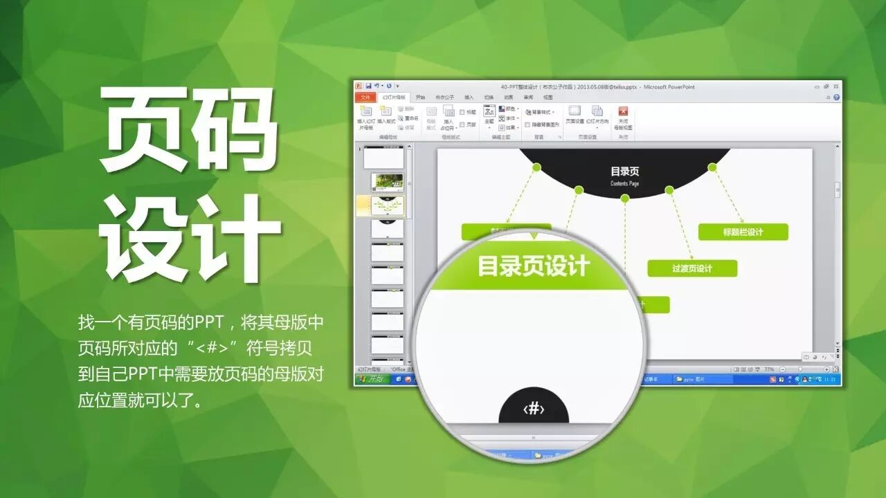 如何设计标题栏的页码呢?找一个有页码的PPT,将其母版中页码所对应的“<#>”符号拷贝到自己PPT中需要放页码的母版对应位置就可以了。